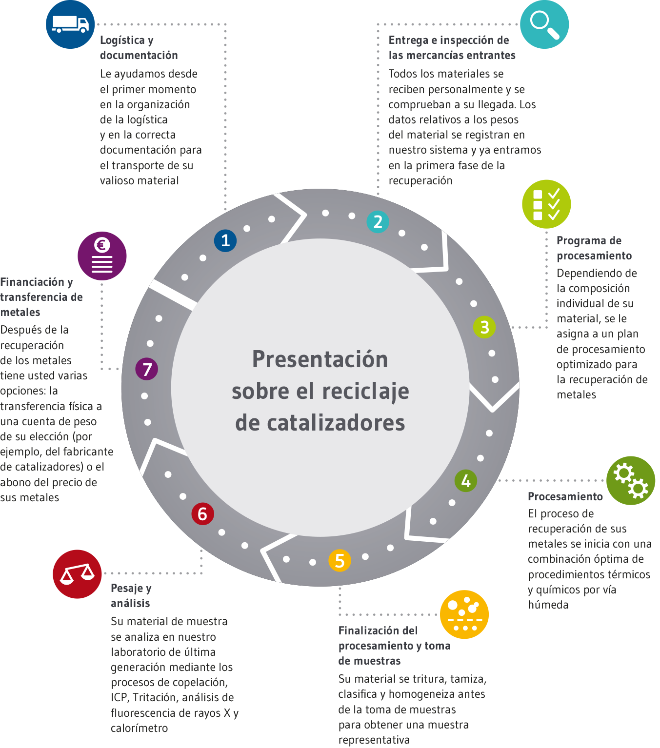 Nuestro objetivo principal es encontrar la solución más eficiente para usted. Esto también incluye familiarizarse de antemano con sus necesidades y llevar a cabo una evaluación del material. Sobre esta base elaboramos una oferta adaptada a sus necesidades individuales, en la que se presentan todos los parámetros pertinentes, como p. ej. los intervalos de facturación, las cuotas de recuperación, los costes de tratamiento y los servicios logísticos que se deben de prestar. Así puede usted evaluar exactamente desde el principio la rentabilidad del reciclaje de los catalizadores. Lo mejor es comprobarlo directamente y conocer mejor cómo funciona. Todo lo que tiene que hacer es ponerse en contacto con nosotros.